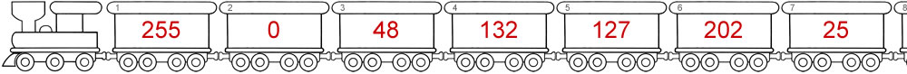 Voilà vous connaissez la grammaire du language DMX! C'est à peut prêt tout ce qu'il y a à savoir Bon ok, je veux bien croire que c'est toujours un peu abstrait, voici donc une petite illustration de notre train DMX et de 7 de ses 512 wagons que je vais utiliser pour citer quelques exemples qui devraient concrétiser un peu tout ça.