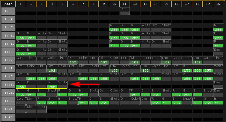 La flêche rouge indique un groupe de channels encadrés en jaune. Il y a ce cadre car j'ai sélectionné auparavant un projecteur dont les fonctions sont: