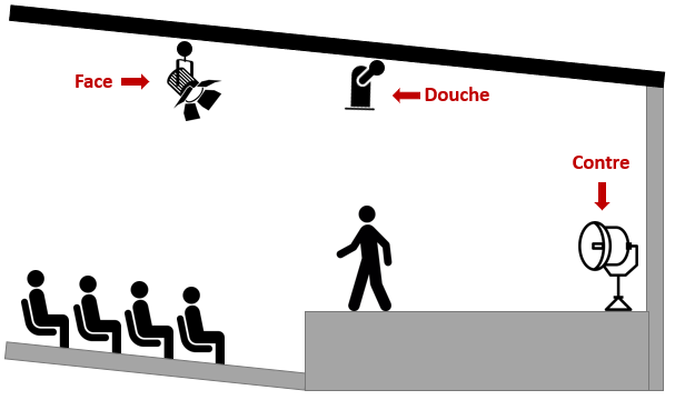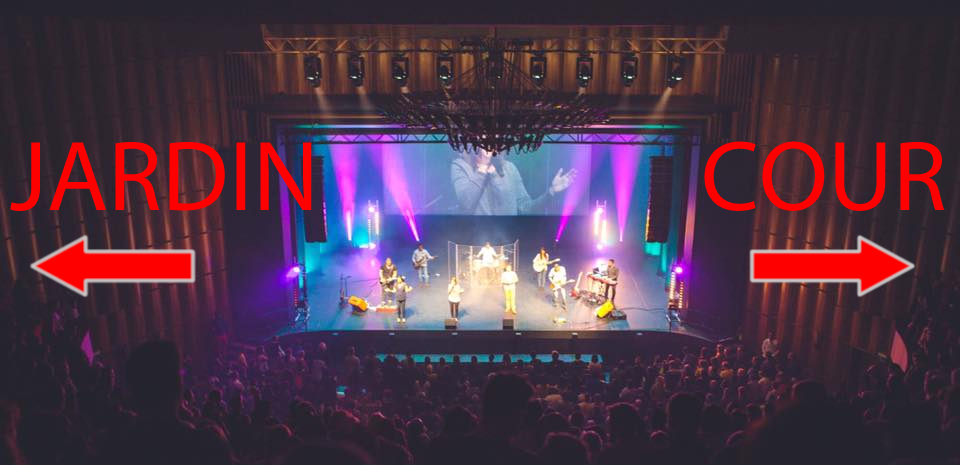 Dans une salle contenant un publique et une scène, la gauche et la droite dépendent de notre emplacement. Si je me trouve dans le public et que je fais face à la scène, ma gauche est inversée par rapport à quelqu'un qui se trouve sur la scène et fait face au publique. Pour éviter ce genre de confusion ou passer son temps à demander: “ta droite ou ma droite?!”, des termes biens spécifiques ont été inventés et ils désignent toujours le même côté: la cour et le jardin. Il suffit de s'imaginer qu'un côté de la salle contient une cour et l'autre un jardin .