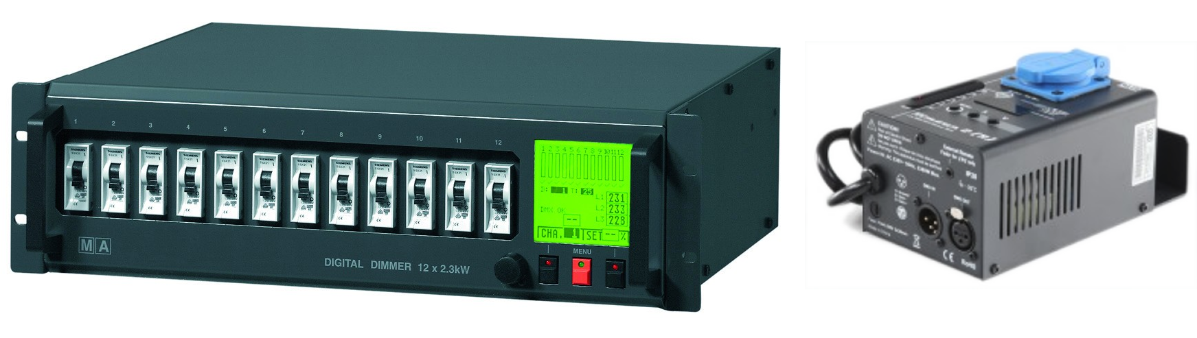 Les gradateurs sont des appareils qui sont capable de transformer un signal DMX en une intensité de courant électrique qui dépend de la valeur du signal DMX envoyé. L'avantage des gradateurs c'est qu'ils permettent de facilement contrôler la puissance d'éclairage d'un projecteur à partir du pupitre. Il sont à utiliser sur les projecteurs “trad” car les autres types de projecteurs ont en général besoin d'une intensité maximum et constante pour assurer toutes les fonctions de l'appareil et l’intensité de la lampe est alors gérée par un gradateur interne.