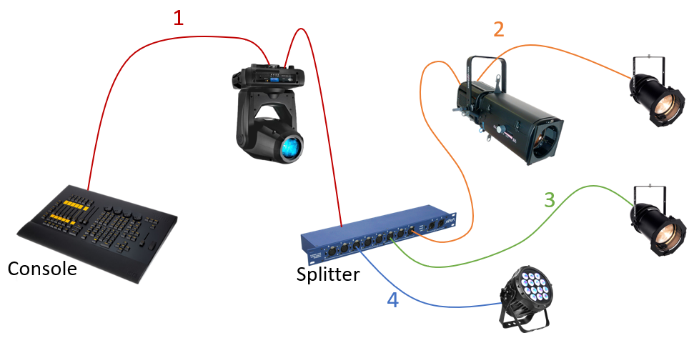 Une ligne désigne un ensemble de fixtures reliées par des câbles en série dont le tout est connecté à une sortie de la console lumière. On peut se représenter cela comme un collier de perles ouvert où chaque perle représente une fixture. Je dit bien “ouvert” car une ligne ne revient jamais à la console (ce n'est pas un circuit ou une boucle). Elle part de la console et se termine en général sur la dernière fixture de la ligne. Il aussi possible d'utiliser des “splitters” permettant de séparer une ligne en plusieurs lignes. Cela a 2 avantages, d'abord un côté pratique pour éviter d'avoir un méli-mélo de câbles qui passent absolument partout mais les splitters aident aussi à “booster” le signal qui passe dans les câbles. En effet plus une ligne est longue et plus il y a de fixtures dessus, plus signal sera faible au bout et potentiellement les dernières fixtures de la ligne ne fonctionneront pas bien ou pas du tout. Un splitter peu être un bon moyen de résoudre ce problème même s'il ne sert pas à créer d'autres lignes. Les câbles sont généralement (et historiquement) du type XLR (voir Les cables XLR), mais il est aussi possible d'utiliser du RJ45 (du câble réseau), c'est plus moderne et le signal peut aller beaucoup plus loin, par contre c'est un peu plus complexe à mettre en oeuvre.
