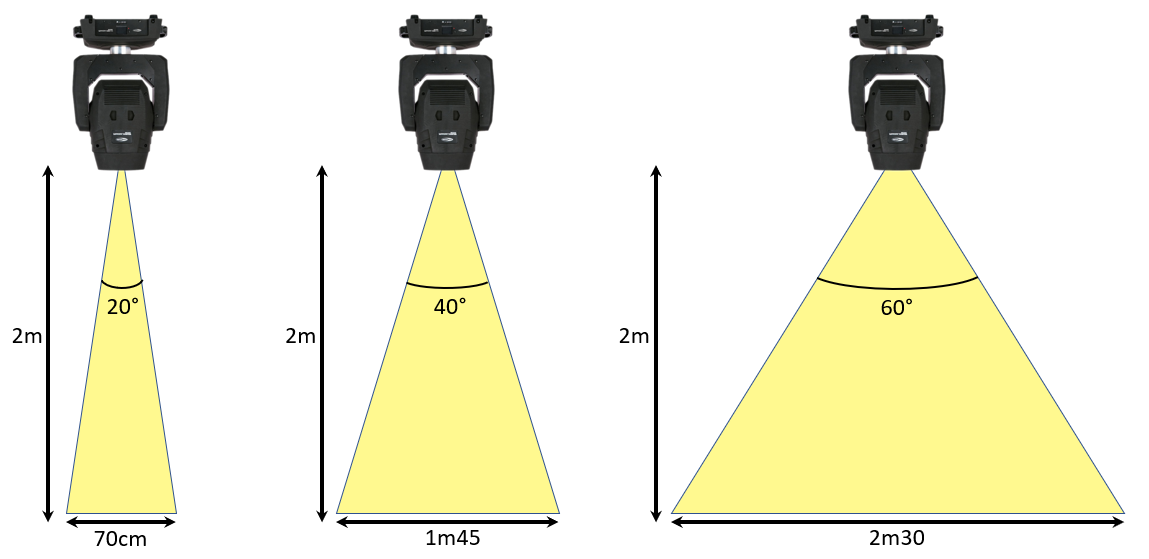 L'ouverture désigne l'angle d'un faisceau de lumière à partir de sa source. Plus l'ouverture est large, plus le spot (le rond de lumière sur la surface projetée) du faisceau aura un gros diamètre. A l'inverse, plus l'ouverture est serrée, plus le spot du faisceau aura un petit diamètre. Le diamètre du spot dépend évidement aussi de la distance entre la source du faisceau et la surface projetée. Le schéma ci-dessous illustre cela: