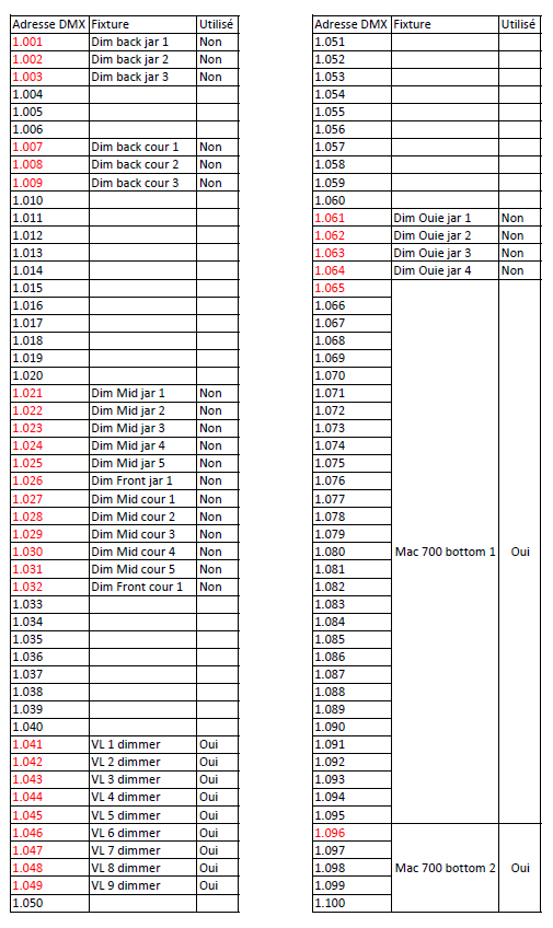 Ci-dessous, un exemple de tableau résumant une partie du plan de patch utilisé au théâtre. Comme c'est très long, il ne montre que les adresses de 1 à 100 sur l'univers 1: